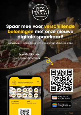 Het aanmaken van je digitale spaarkaart is heel eenvoudig en kan direct via de link: qr.onme.nl/restariapannenschuur. Na een korte registratie voeg je de kaart toe aan de Wallet-app op je telefoon, zodat je op ieder moment je actuele saldo en het huidige spaardoel kunt bekijken.